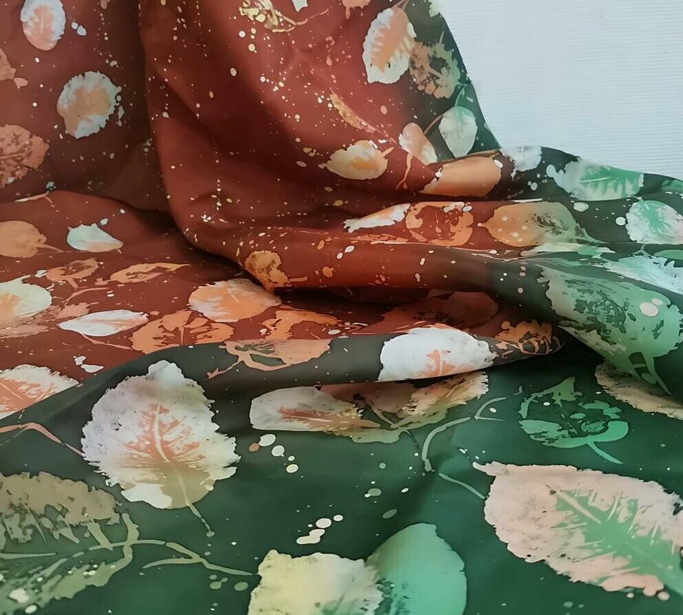 Перенеслись в любимое время года — в золотую осень. Солнце светило, кружились листья...и падали на наш шелк.