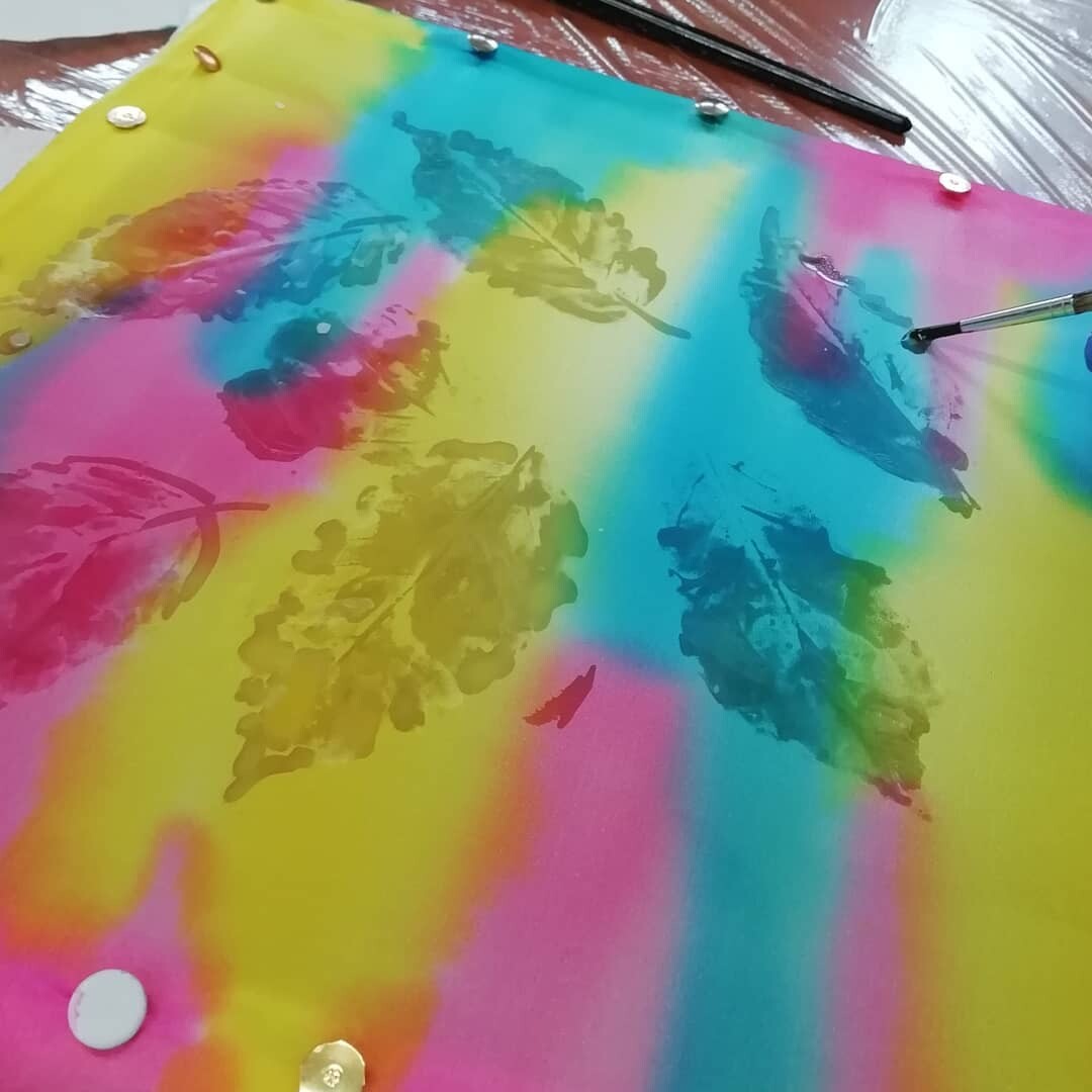 Да, работы учебные и они небольшого формата (30х30 см), но и техник мы изучаем сразу несколько - поработали с отпечатками, с цветовыми перекрытиями, со штампами и кистью.