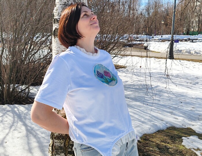 Напомню-я хотела сделать образ на одежде с первоцветами "Вечная весна". Белый цвет одежды - символизирует снег. Шелк и рыхлость нити шерстяной создают тему - подтаявщего снега, рыхлого, нежного...вот-вот и прорвутся сквозь него первые цветочки. Которые вы тоже видите на груди. Помню лозунг одной мое...