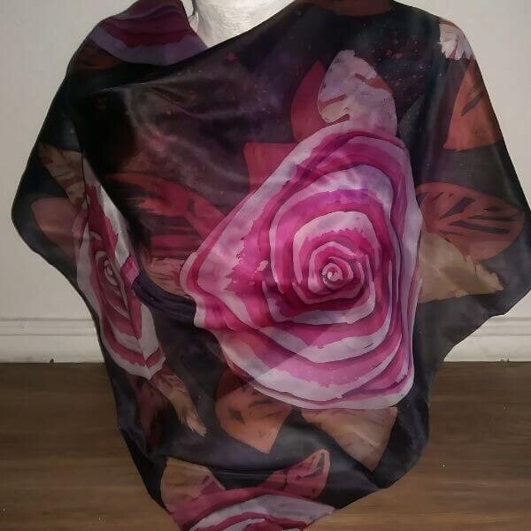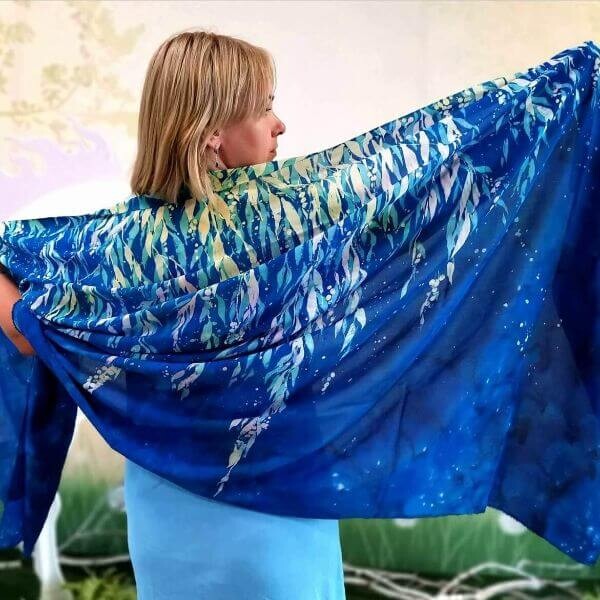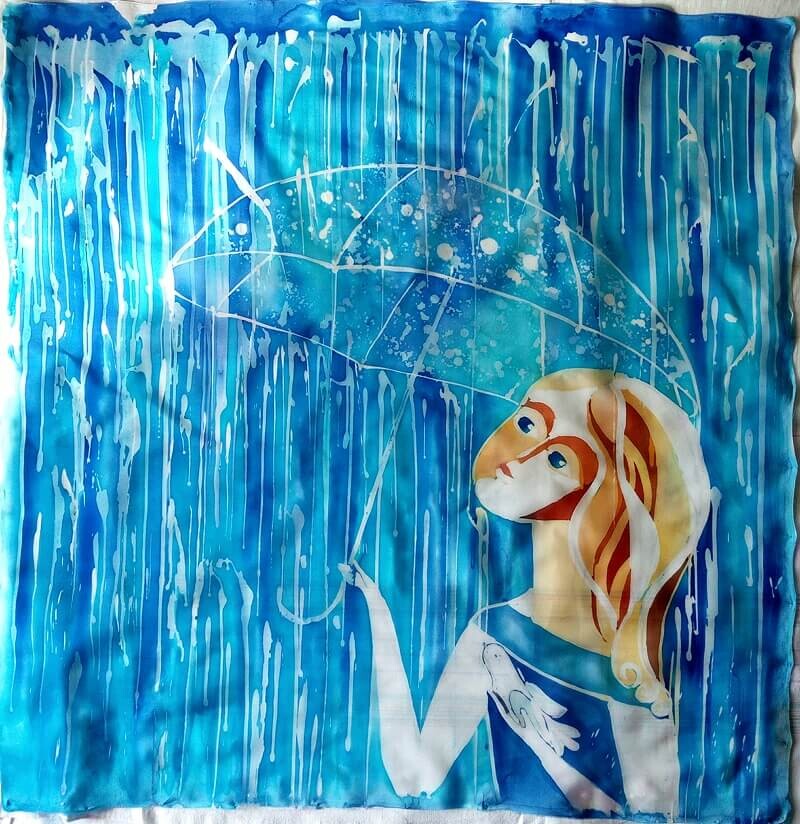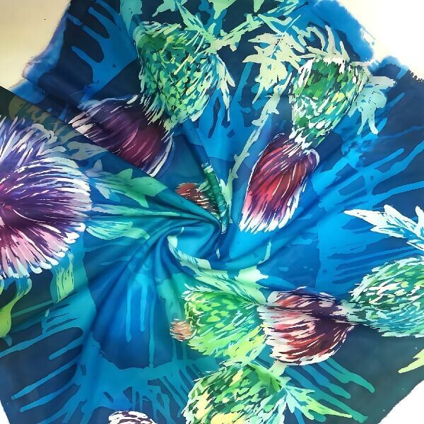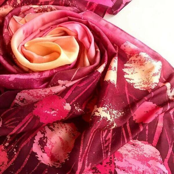 В технике горячего батика на шелке. Шелковый платок, который станет украшением любого женского образа.