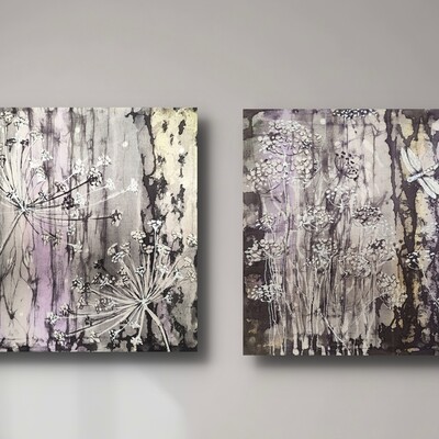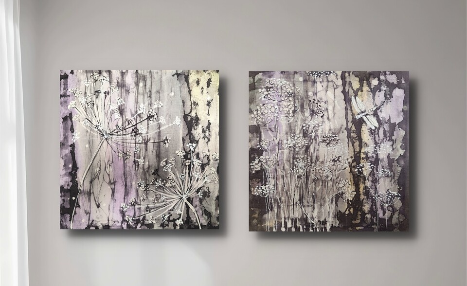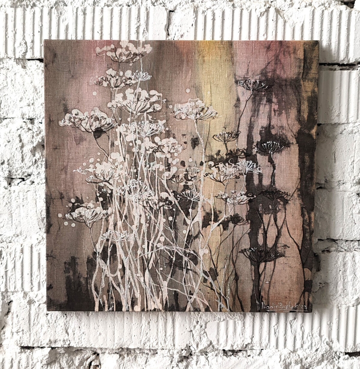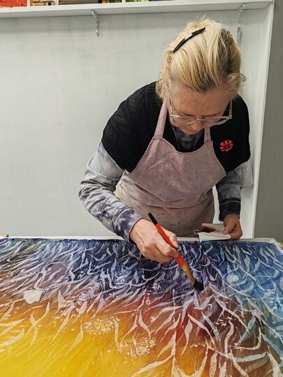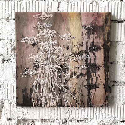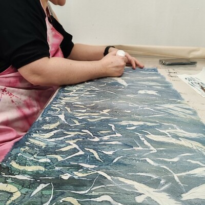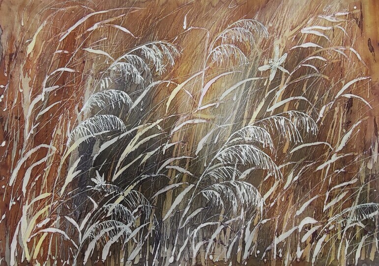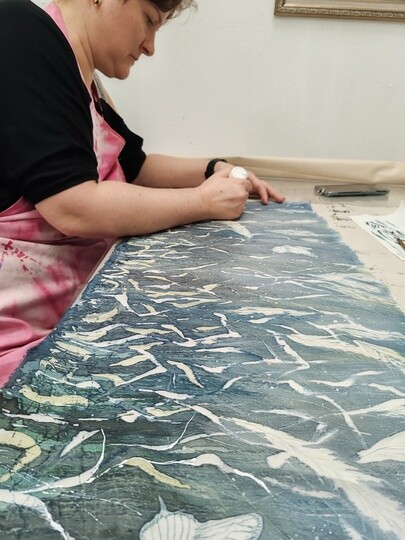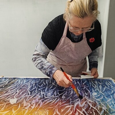 Выполнена в технике горячего батика, плюс авторские приёмы — поливка воском, ботанический ореол, эффекты валика и кракелюры.