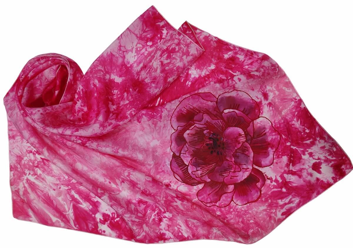 Платок окрашиваем в технике шибори — живые переливы цвета. А сверху — шикарный цветок с чётким контуром.