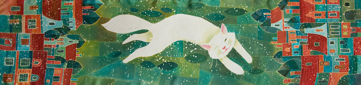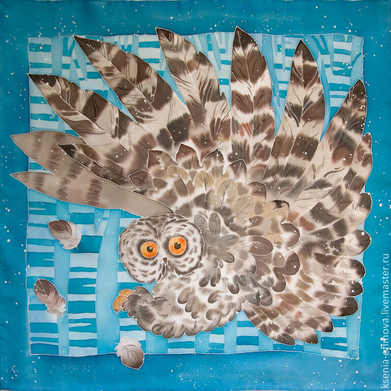 Мы нарисуем на шелке снежного кота в технике многослойного холодного батика с элементами горячего. Это может быть платок (панно). Размер платка около 70х70.