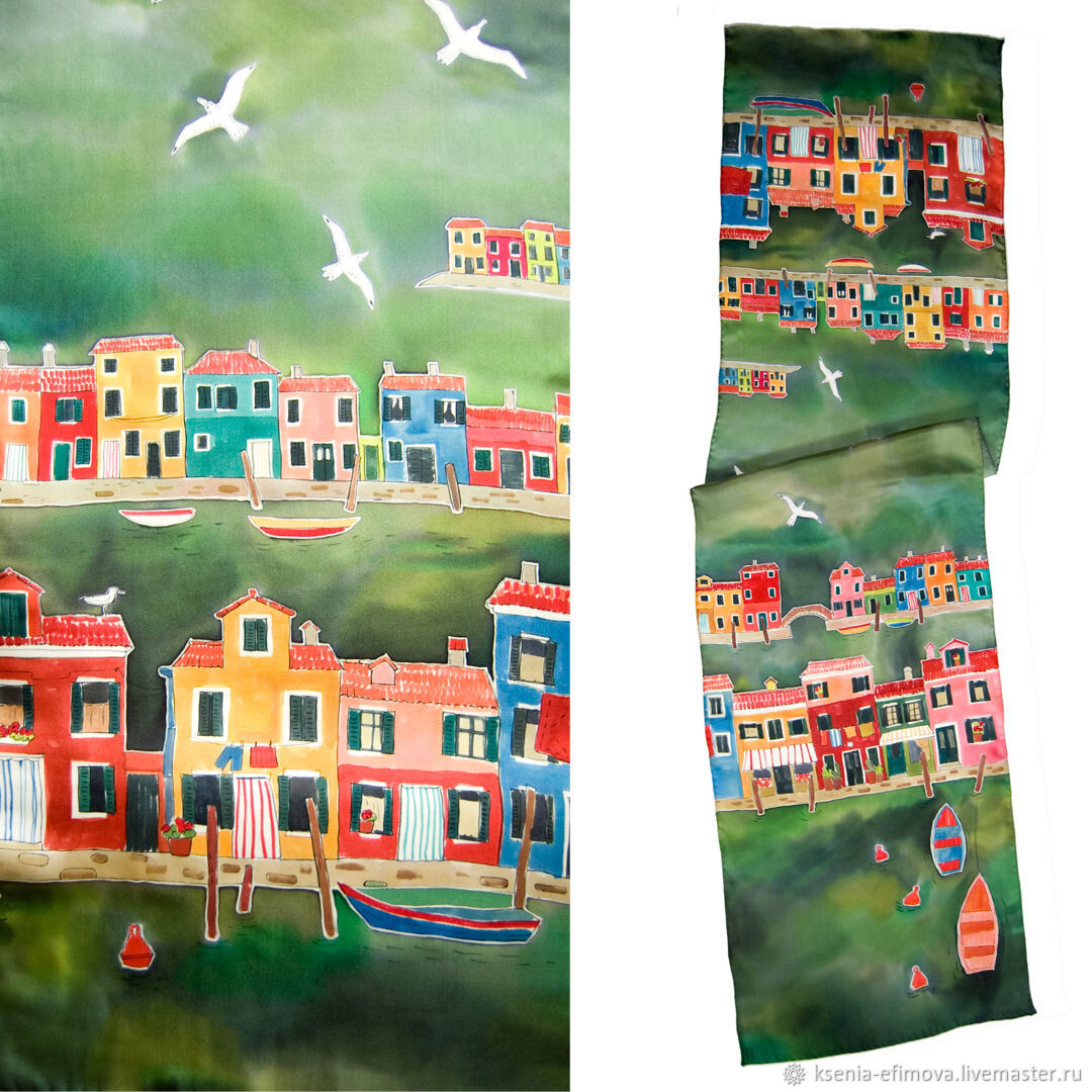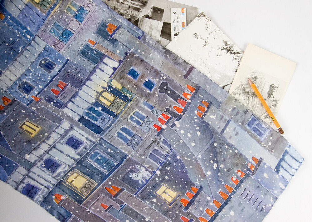 Мне нравится работать с тканью, нравится создавать то, что можно на себя надеть и мне нравится рисовать, работать с линией, цветом. Люблю тонкие прорисовки и широкие заливки, брызги горячего батика и графичность холодного. Мне нравится экспериментировать, так чтобы не сразу было понятно, как это сделано, в какой технике. Работаю я чаще всего в технике многослойного холодного батика, добавляя в него по чуть-чуть горячий и свободную роспись.